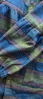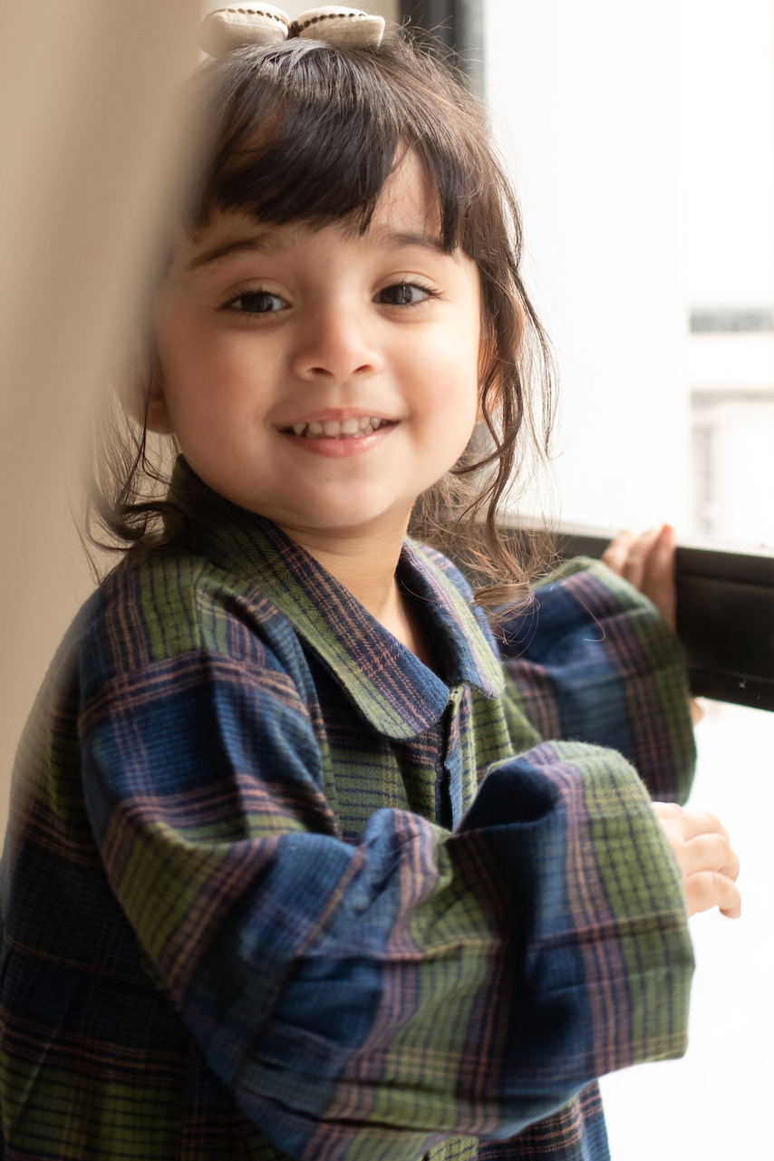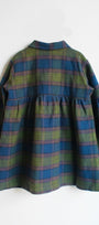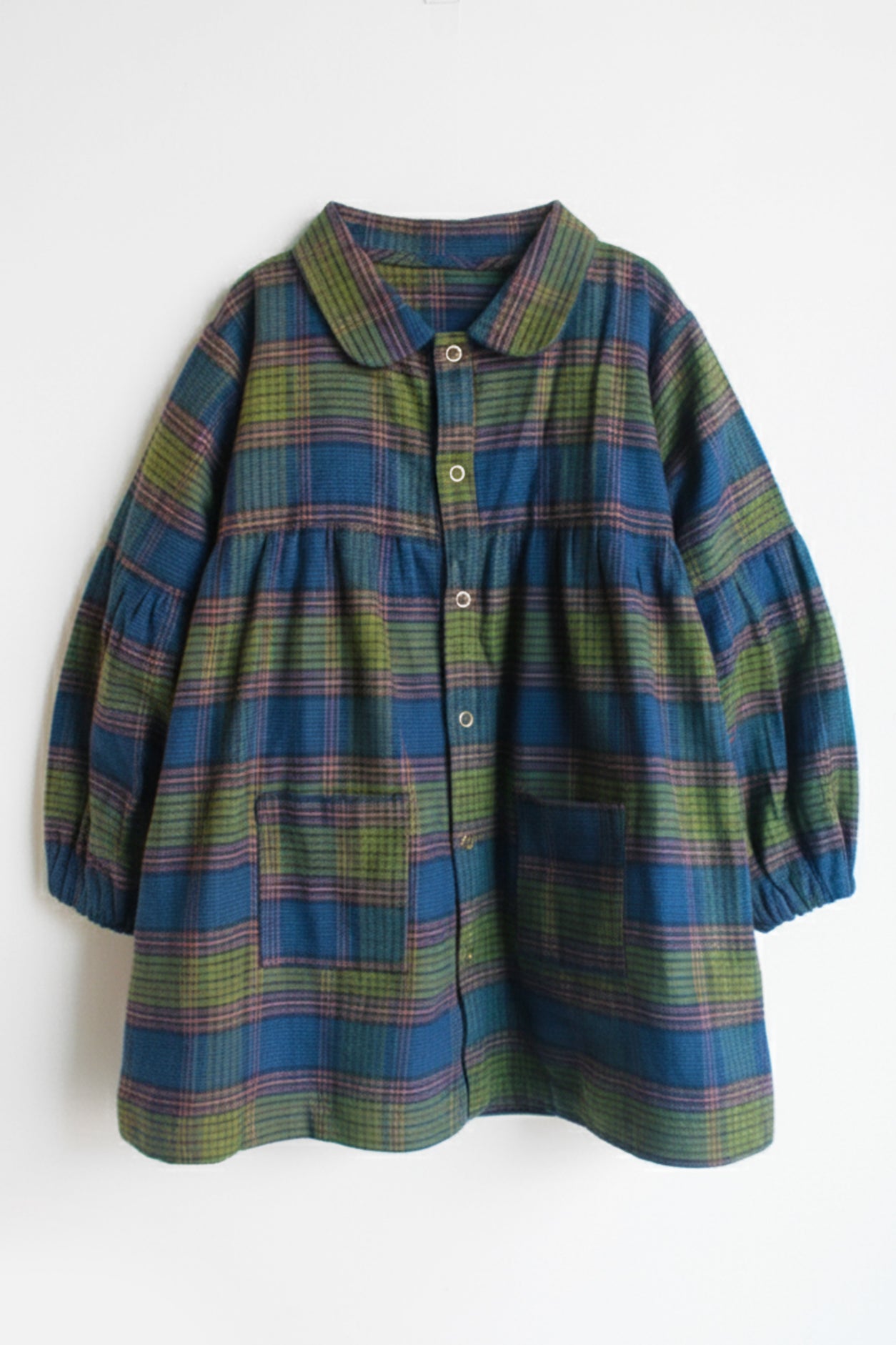 Soft cotton flannel. Round neckline with a Peter Pan collar, and long sleeves with elasticated, frilled cuffs. Gathered seam at the waist for added volume.